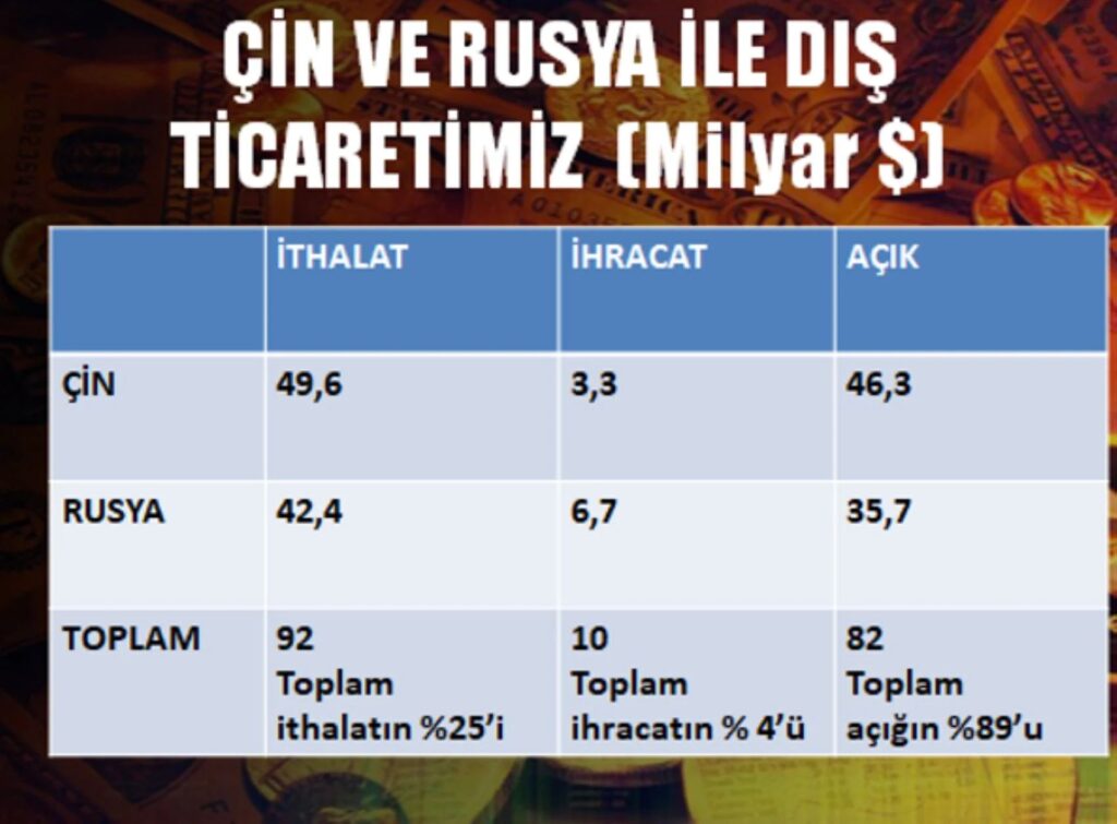 Çin ile ticaretimizde 46.3 milyar dolar, Rusya ile ticaretimizde 35,7 milyar dolar açık veriyoruz. ABD ile ticarette açık sadece 1.3 milyar dolar… Toplam dış ticaret açığımız 92 milyar dolar. 82 milyar doları Çin ve Rusya’dan kaynaklanıyor.
