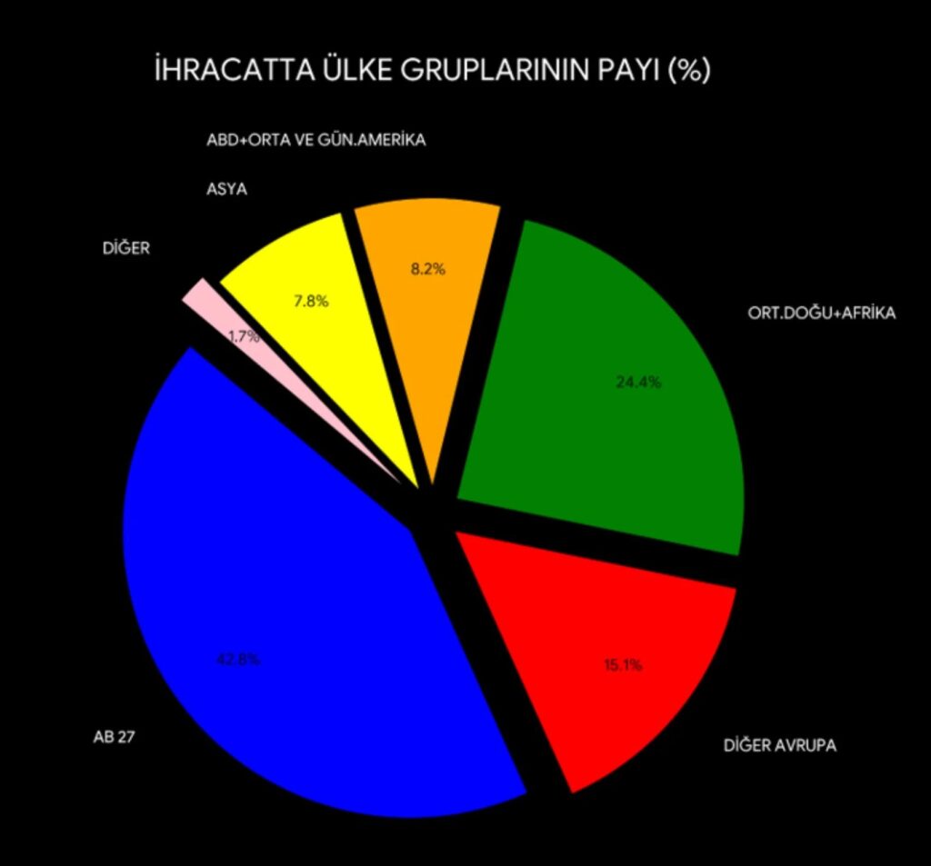 Türkiye’nin ihracatına bakalım… İhracatımızın yüzde 43’ü AB ülkeleri, yüzde 15’ü, AB üyesi olmayan diğer Avrupa ülkeleri… Toplam yüzde 58’i Avrupa…